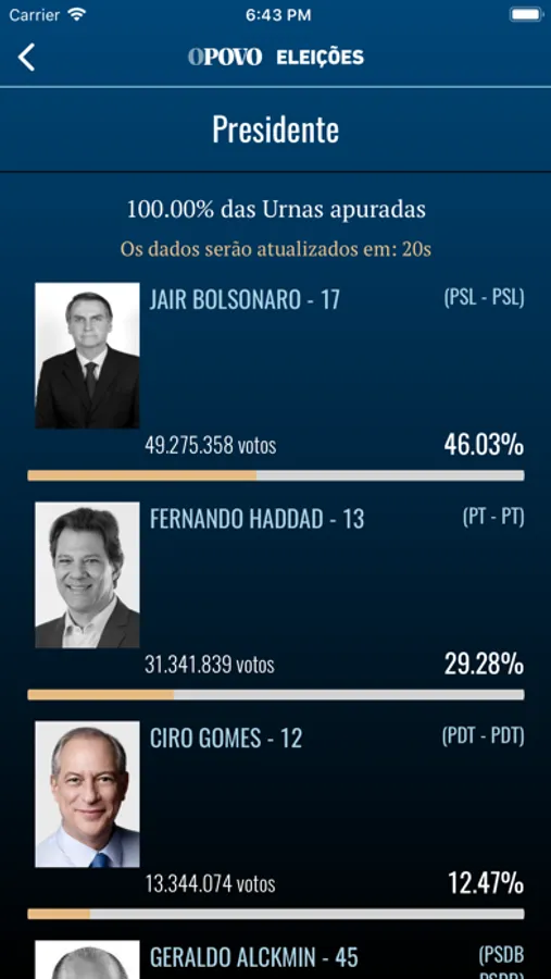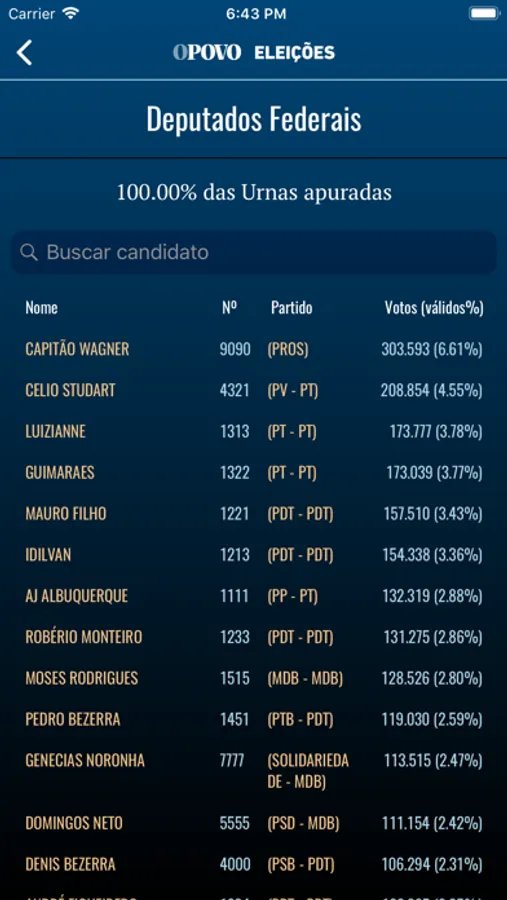 O POVO Eleições acompanha em tempo real a apuração das urnas de todos os candidatos para o pleito 2018. Você pode fazer a consulta pelo seu candidato a deputado federal, estadual, senador e presidente.