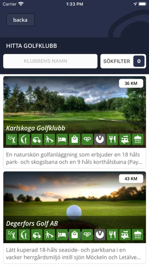 - Filtrera golfklubbar med faciliteter, golfdistrikt, betyg, m.m.