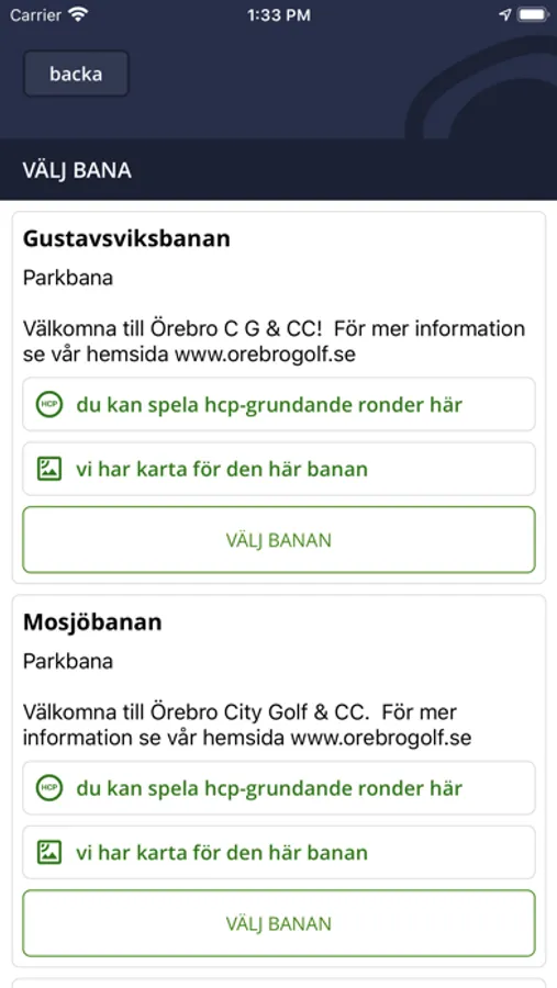 - Kontaktuppgifter, baninformation, priser, slopekalkylator, scorekort m.m.