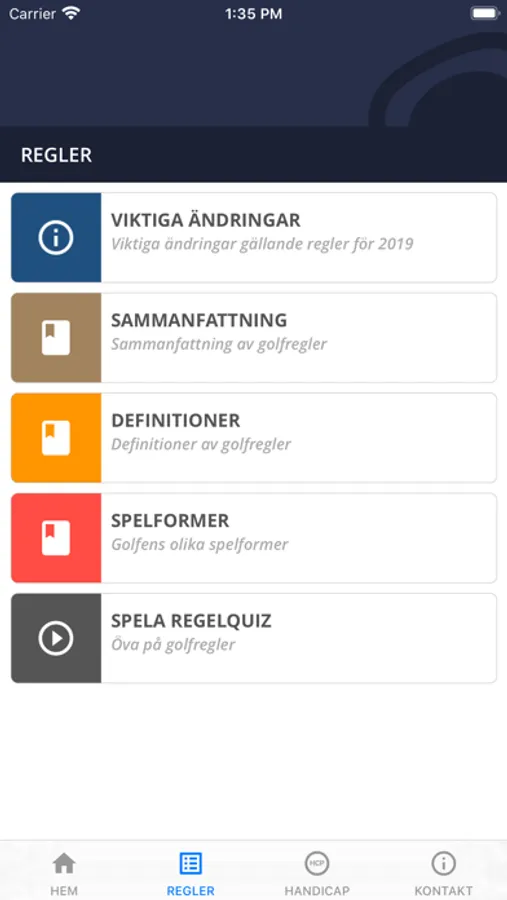 Appen innehåller viktiga ändringar för golfregler 2019, sammanfattade golfregler, en beskrivning av golfens spelformer och olika golftermer. Med hjälp av en quiz med golfregler kan du testa dina egna kunskaper.