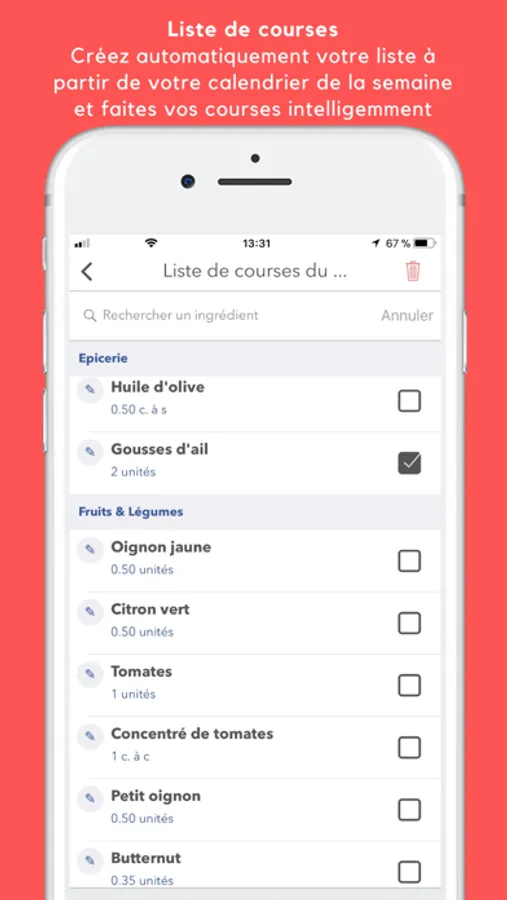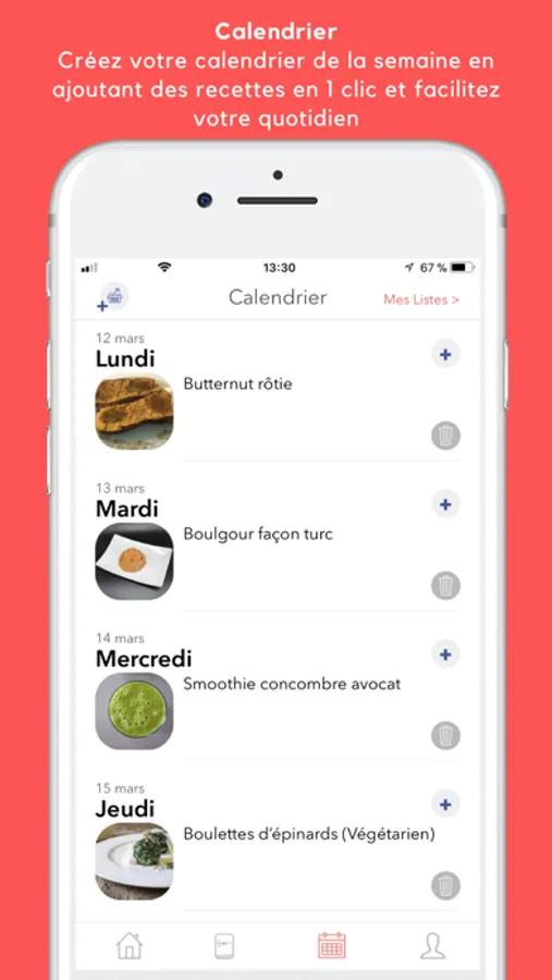 Organisez au mieux vos repas en créant votre Calendrier de menus pour toute la semaine et générez automatiquement votre liste de courses en 1 clic. Et partagez cette liste de courses avec votre compagnon, vos enfants, vos colocs...