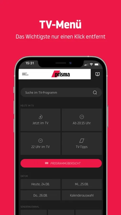 "prisma – deine TV-Programm-App" bietet dir übrigens nicht nur das Fernsehprogramm übersichtlich und einfach aufbereitet an. In den News findest du Neuigkeiten aus der Film- und Fernsehwelt sowie TV-Kritiken zu ausgewählten Sendungen wie zum Beispiel "Tatort". Außerdem hast du Zugriff auf ein umfangreiches Film- und Star-Archiv mit ausführlichen Schauspielerporträts – natürlich alles kostenlos. Mit weiteren Inhalten aus unserer wöchentlich erscheinenden Fernsehzeitschrift kannst du zudem die ganze Welt von prisma entdecken. Schau einfach rein, denn spannende Themen aus den Rubriken Reise, Gesundheit, Kultur oder Ratgeber warten auf dich.