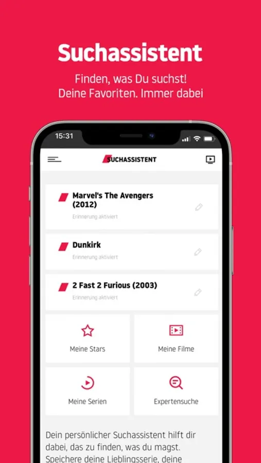 • Ein Suchassistent, der dir dabei hilft, deine Lieblingsfilme, Lieblingsschauspieler oder Lieblingsserien zu finden. Du musst nur einmal suchen und wirst benachrichtigt, sobald das im Fernsehen läuft, was dir gefällt.