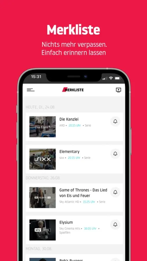 • Eine Merkliste mit Erinnerungsfunktion, in der du deine Lieblingssendungen eintragen kannst. Ob Serie, Dokumentation oder Spielfilm: So verpasst du nichts, was dich interessiert.