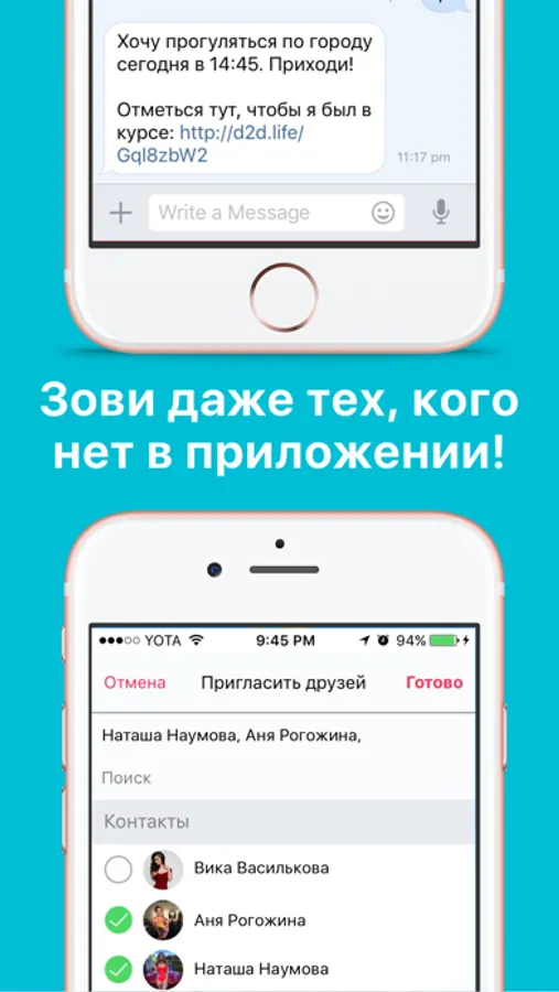 Освободился и хочешь пообедать, сходить в кино с друзьями или просто выпить пива в баре? Открой Day2Day и собери друзей на тусовку! Приглашай друзей из ВКонтакте, они смогут ответить на приглашения даже если у них нет приложения!
