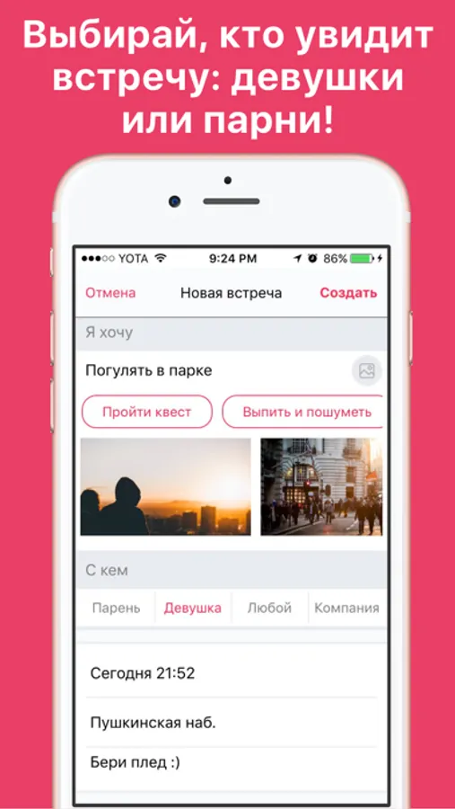 Хочешь отдохнуть вечером или на выходных? Day2Day поможет быстро найти куда пойти — не важно, через неделю будет встреча или прямо сейчас. Расскажи, чем хочешь заняться, и выбирай, с кем пойти.