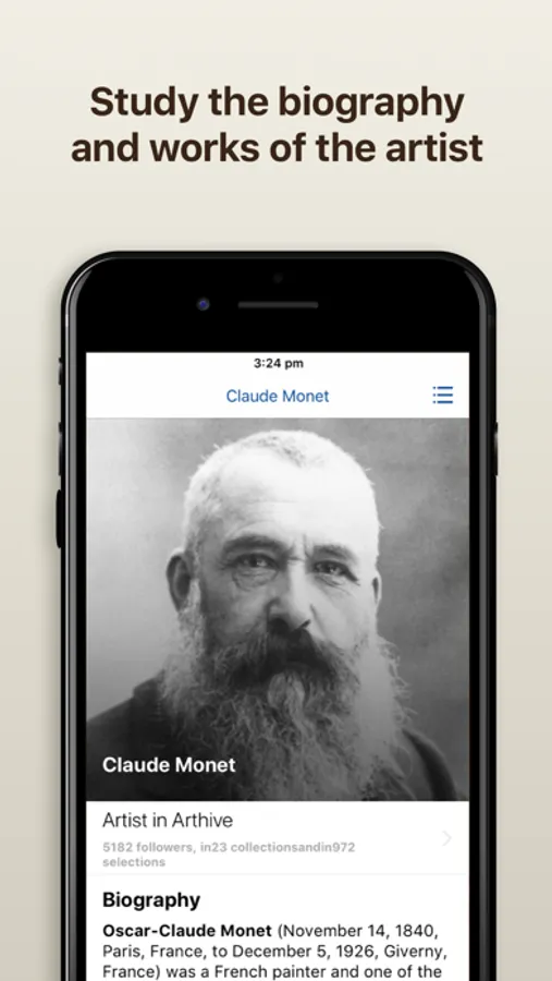 The Claude Monet app is an extensive guide to the life and work of the great impressionist, compiled by the Arthive experts. The app includes information that is more complete than most encyclopedias, and more precisely than any online gallery.
