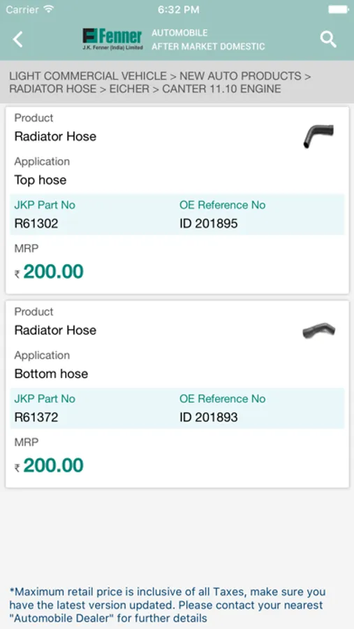 In this application you will find all of the information about the Auto After Market Domestic Products such as Fenner Belts and JK Pioneer Oil Seals, EPDM Radiator Hoses Automotive applications, besides range of other Automobile Accessories – Anti Vibration Mounts, Bush Kits, Center Joint Rubber & Bearing assemblies, Radiator Hoses, Valves (2 & 3 Wheelers) and Belt Tensioners.