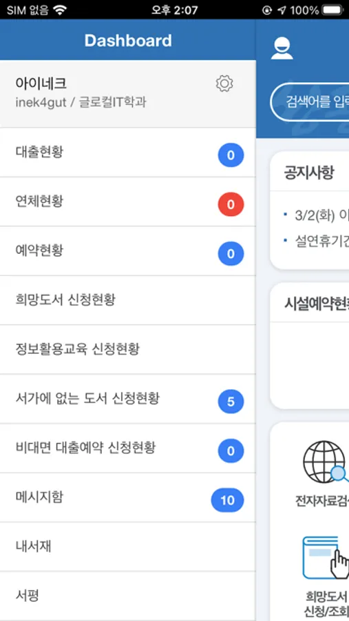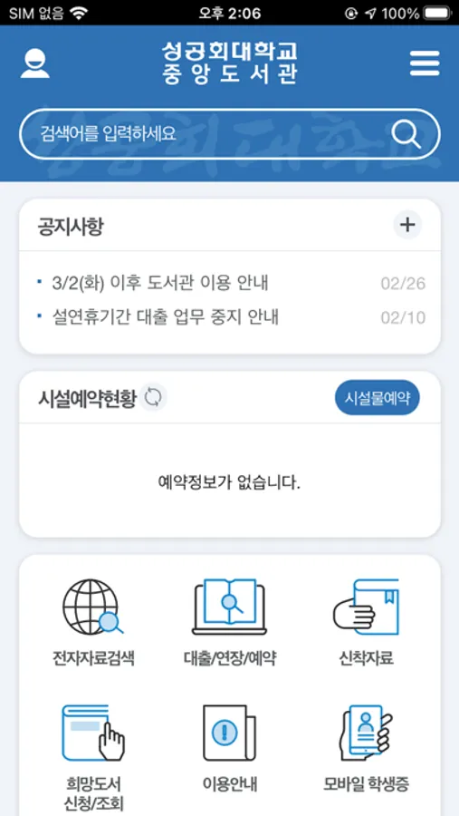 - 도서관 소장정보 등의 검색기능과 관련서비스를 제공합니다.