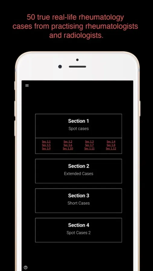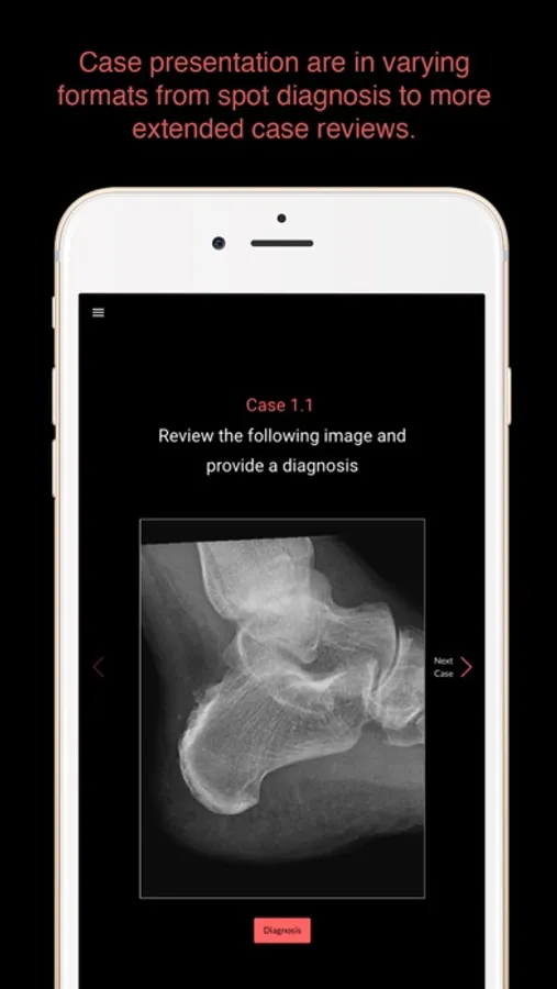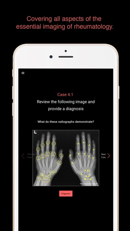 This App provides an intuitive interactive review of 50 true real-life rheumatology cases from practising rheumatologists and radiologists. Case presentation are in varying formats from spot diagnosis to more extended case reviews covering all aspects of the essential imaging of rheumatology.