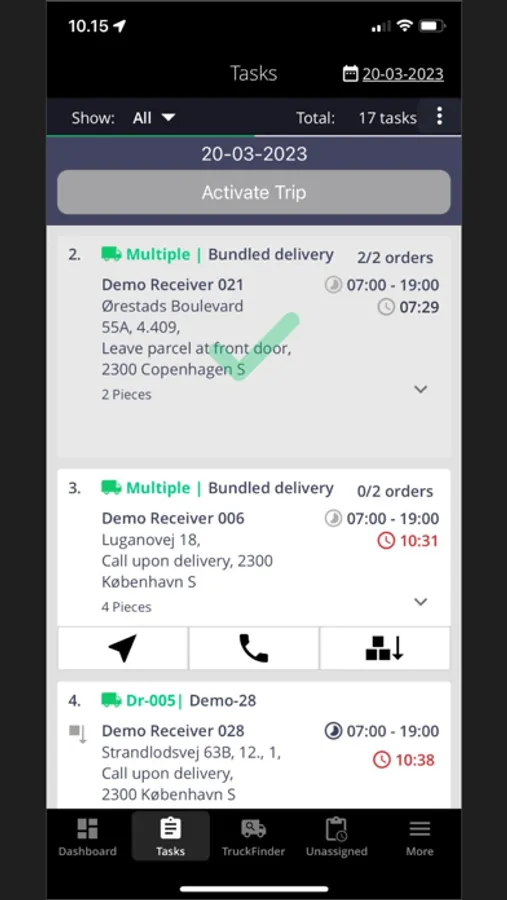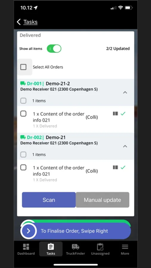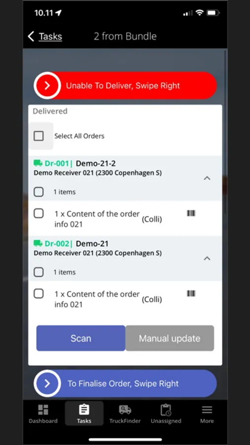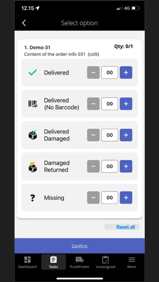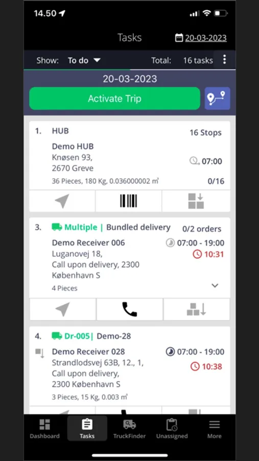 In the App, you can update, create, accept, or reject new tasks, as well as assign them to other drivers.