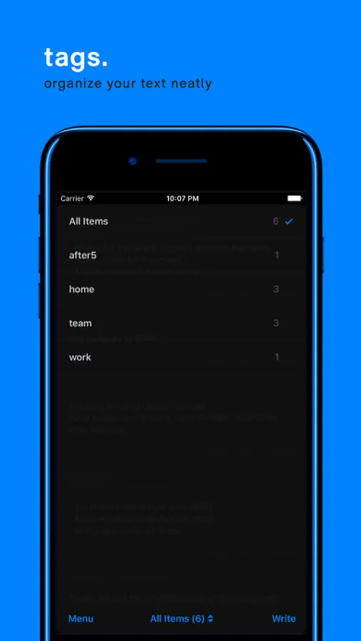 Reminders, snippets, drafts, and more. Your text is neatly organized by adding 'tags' so that you can easily pick up and reuse by coping to pasteboard.