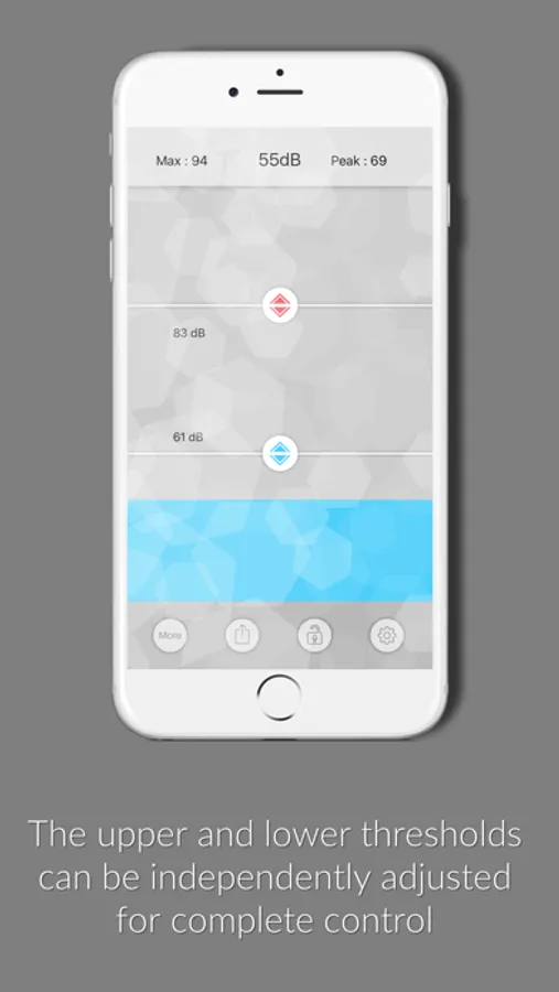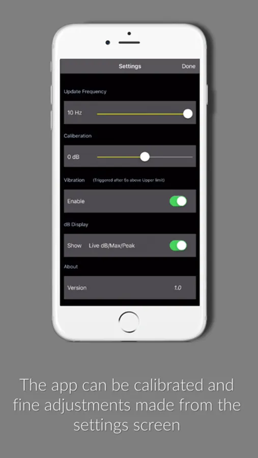 The Current, Maximum and Peak dB values are displayed on the main screen, these can be switched ON/OFF as required. The Peak value can be reset at any time by simply tapping on it.