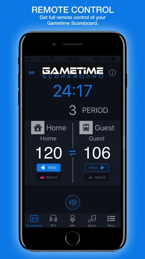 The Gametime Scoreboard app allows you to control your electronic scoreboard from a distance. Use your smart device to control the time and score. You can use the microphone feature to address the crowd or do the play by play announcing. You can also play your favorite tunes and upload or record your own stadium sound effects!