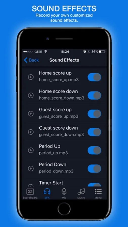 The SFX page of the app allows the user to start or stop a crowd sound effect on your Gametime Scoreboard. Once pressed, this sound effect will bring a unique crowd effect during your game. You can also upload or record your own crowd effect to truly make it a home game! The "Buzzer Only" feature shuts off all sound effects aside from the buzzer that sounds at the end of the game.