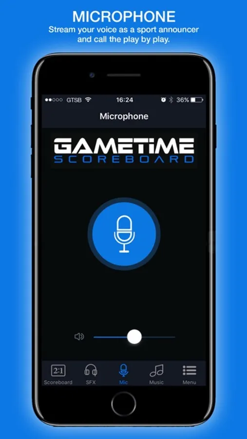 The Microphone application allows you to speak in real time using a secure, Wi-Fi network. A press of the Mic button will activate the microphone and your voice will stream to your Gametime Scoreboard’s speakers. You can adjust the volume with the bar located under the play button. To stop using the microphone, just push the button again and the transmission will stop. This useful feature allows you to address a group or do the play by play during the game.