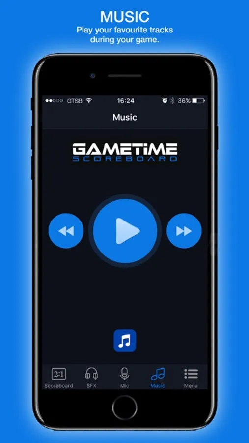 The Music page allows you to play your music from your smart device and create a dynamic atmosphere for your favorite games. By pressing the musical note in the blue box, the app directs you to your iTunes. From there you can choose your favorite songs to play from your Gametime Scoreboard unit.