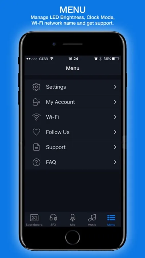 In the "Settings" page, found in the menu, you can adjust the brightness of the LED’s on the unit. It will allow you to clearly see the numbers Inside and Out during a sunny day. If you want to listen to the music only without seeing the score, you can select "Dark Mode". This will also extend the life of the battery. With the "Clock" mode, you can sync your iPhone or iPad’s time and it will be the only thing showing on the front panel.