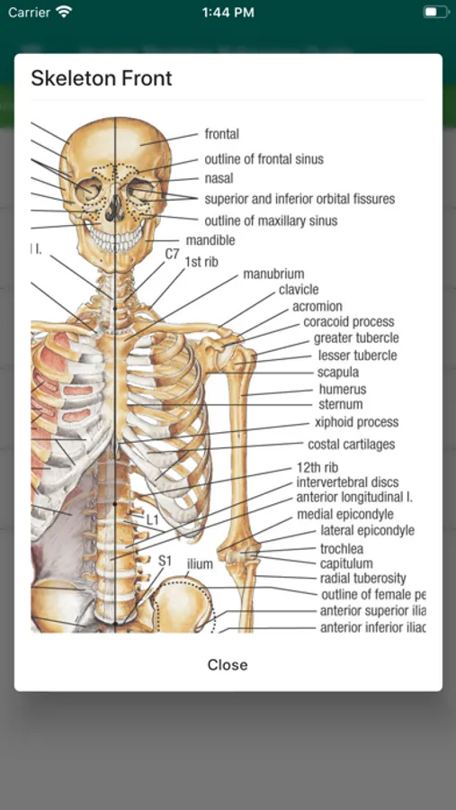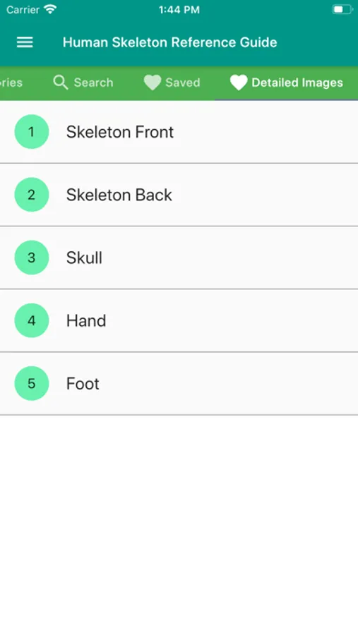 This apps covers information about each bone in the human body and splits them up into 4 categories: Vertebral Column, Skull, Arm and Leg.