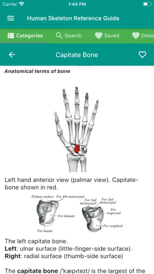 This app allows you to search for and save your selected skeleton topic for quicker access helping you to study various bones in a more intuitive manner.