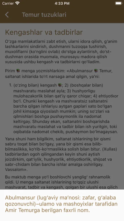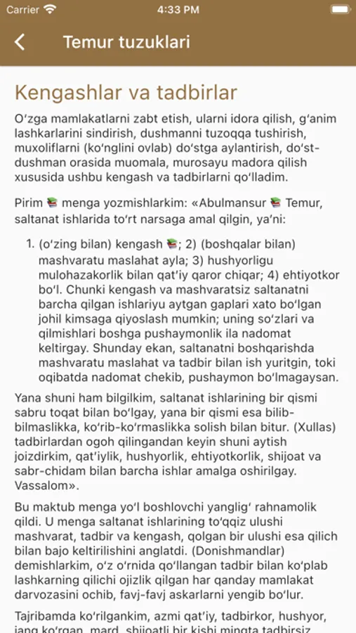 Ma'lumki, buyuk bobokalonimiz Amir Temurning "Temur tuzuklari" asari mustaqillik yillarida milliy madaniy merosimizning Nodir namunasi sifatida qayta tiklandi va bir necha bor nashr etildi. "Temur tuzuklari" asari veb-sayt shaklida ham taqdim etildi (www.temurtuzuklari.uz) ushbu loyiha UZINFOCOM markazi tomonidan O'zbekiston Respublikasi axborot texnologiyalari va kommunikatsiyalarini rivojlantirish vazirligi rahbariyati tomonidan ishlab chiqilgan bo'lib, u faqat o'zbek tilida mavjud.