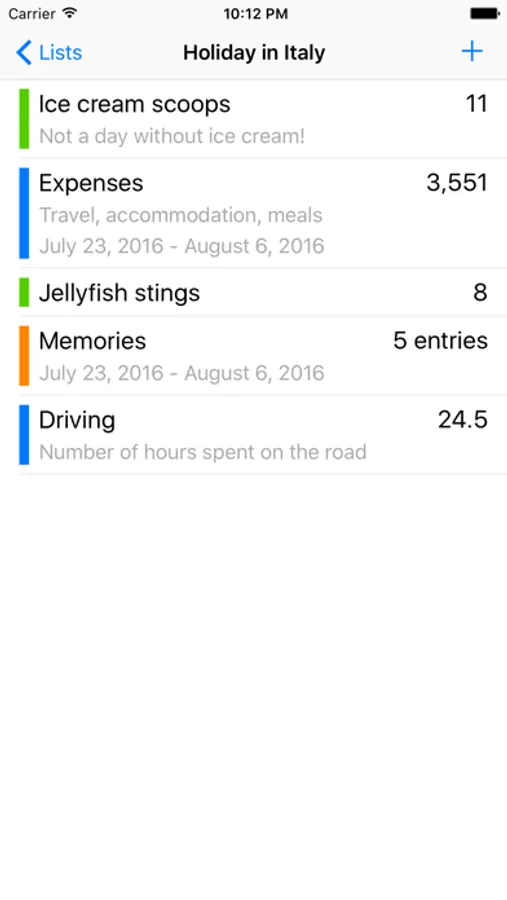 Define your lists and keep track of everything imaginable (total money spent on cars, number of pizzas eaten last month, fuel costs per year, holiday diary, weight gain&loss log, number of times your dog destroyed the apartment) using different types of items: