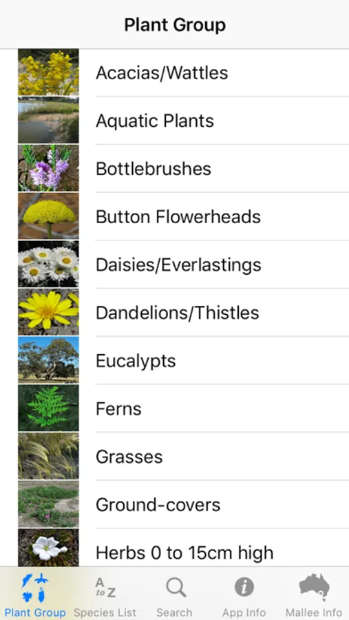 * Not just a wildflower app, many of the mallee Ferns, Grasses, Conifers, Rushes, Sedges, Saltbushes and Bluefishes are covered.