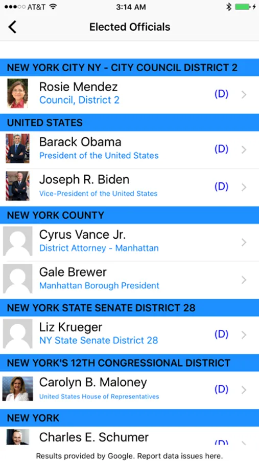 For any residential address in the United States you can look up who represents that address at each elected level of government. You can interact with elected officials via Facebook, Twitter and Email. Easily access their YouTube channel or website.