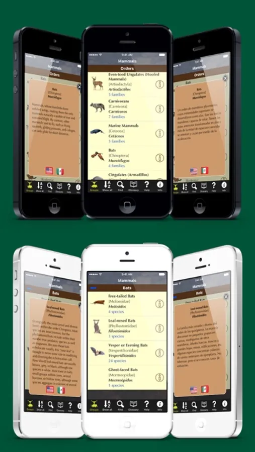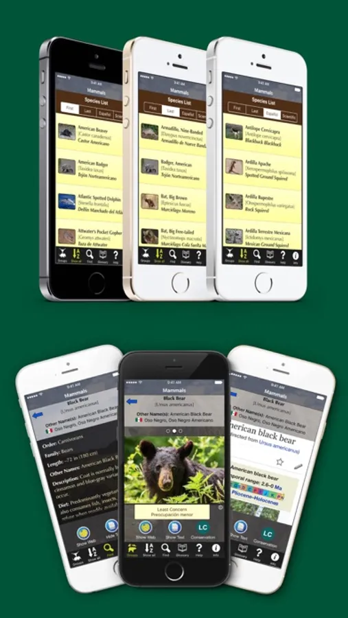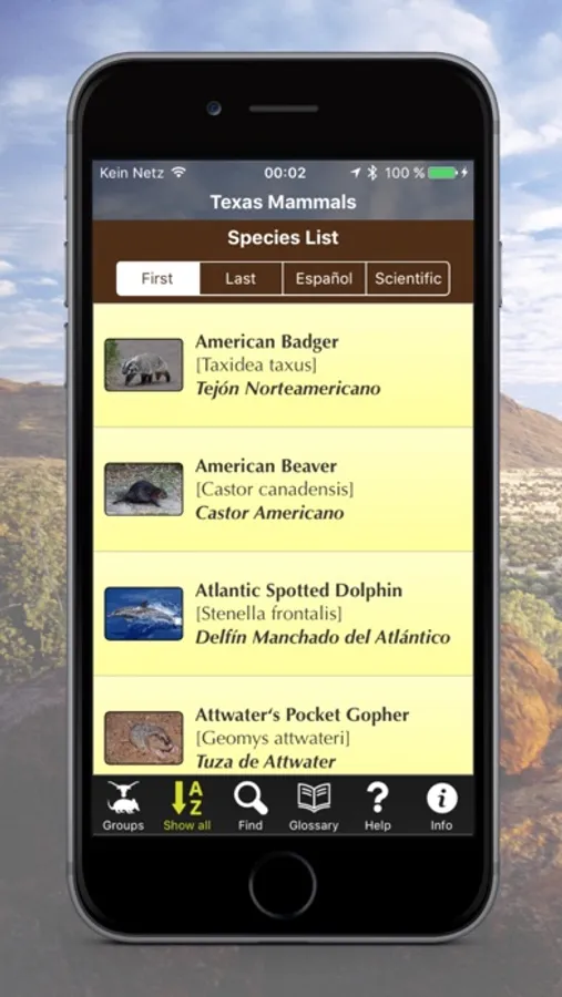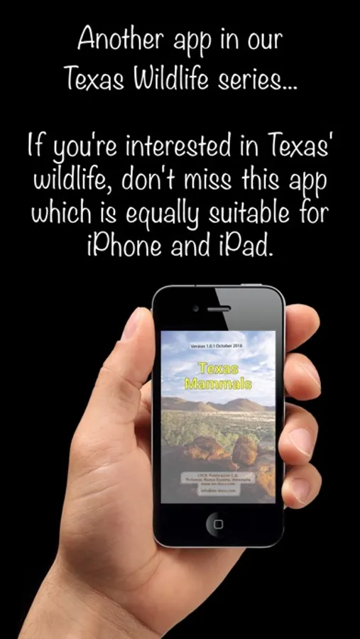 This app shows more than 170 mammal species found in Texas, including the marine mammals in the Gulf of Mexico. For each animal there are two or more high-resolution pictures, a brief description, and a link to view the corresponding Wikipedia pages within the application window. All descriptive information is in English, the animal names are also shown in scientific (Latin) denomination and in Spanish.