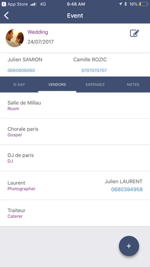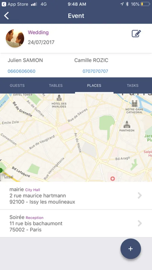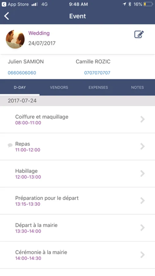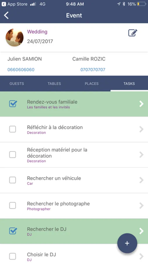 L'application Wedding Plan vous permet de retrouver toutes les informations essentielles à la gestion de vos mariages. Synchronisez avec votre interface Web, vous retrouvez la liste des invités, les dépenses, votre carnet d'adresses de prestataires, le programme du Jour J, le rétro-planning ainsi que les lieux de l'événement.