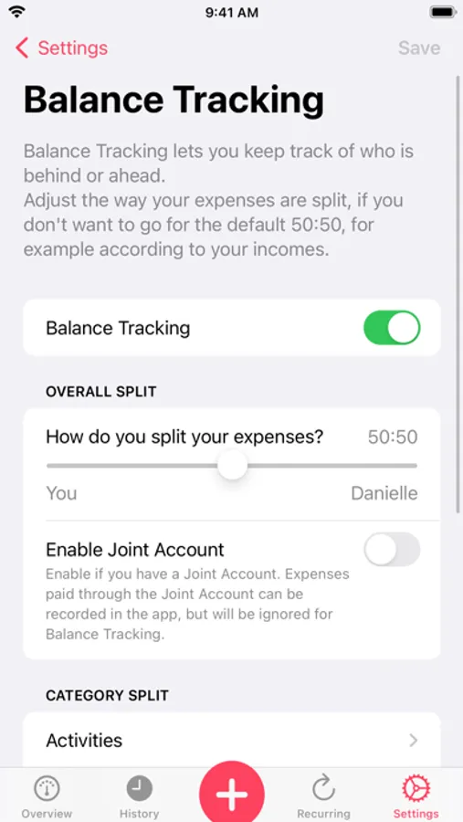 Split expenses 50:50 or by another ratio, including on specific categories