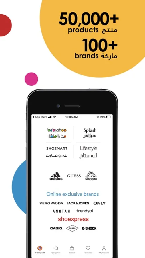 بنقدم لك في تطبيق سنتربوينت أكثر من 500 ماركة و 70,000 منتج لكل العائلة بما في ذلك الأزياء النسائية والرجالية وملابس الأطفال، بالإضافة لمنتجات التجميل والمكياج وديكور المنزل. تسوق أونلاين مع تشكيلة كبيرة من أفضل العلامات التجارية مثل أديداس، نايك، بوما، جاك أند جونز، ترينديول، جيس لي كوبر، زيفام، آيروبوستال والمزيد.