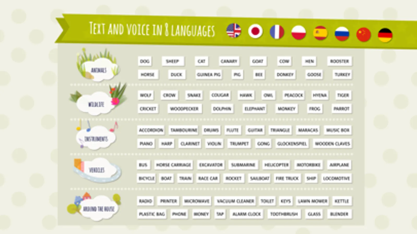 • 6 categories: Animals, Wildlife, Around the house, Vehicles, Instruments, Mixed