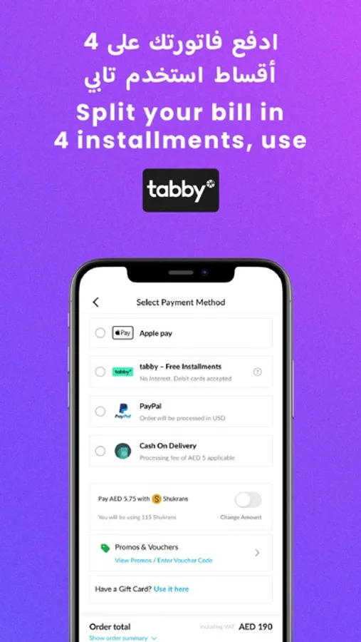 • Pay by cash, credit or debit Cards, international Credit Cards, Shukran, Tabby in Easy Installments