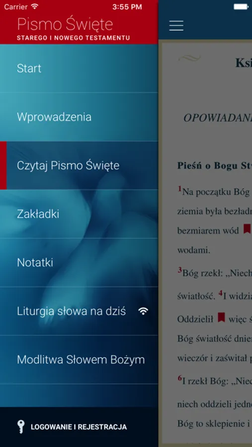 Dostęp do pełnego tekstu Pisma Świętego uzyskuje się poprzez założenie konta i zalogowanie do aplikacji.