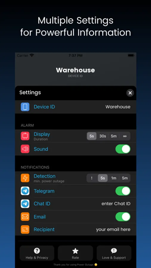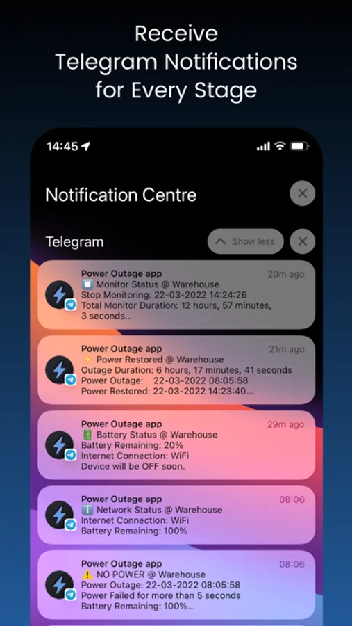 • In case of power failure it will send you a Telegram message or email