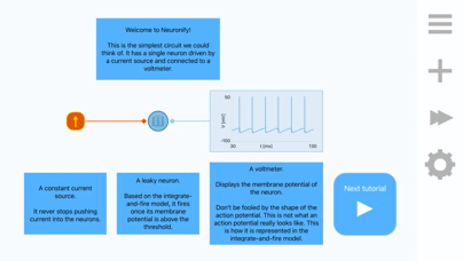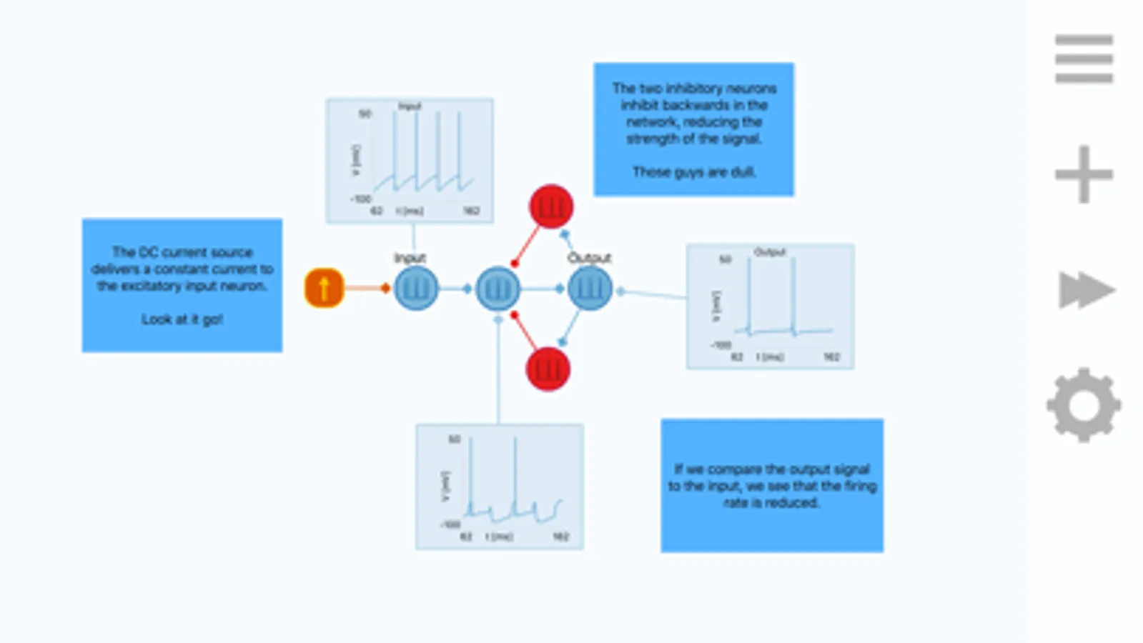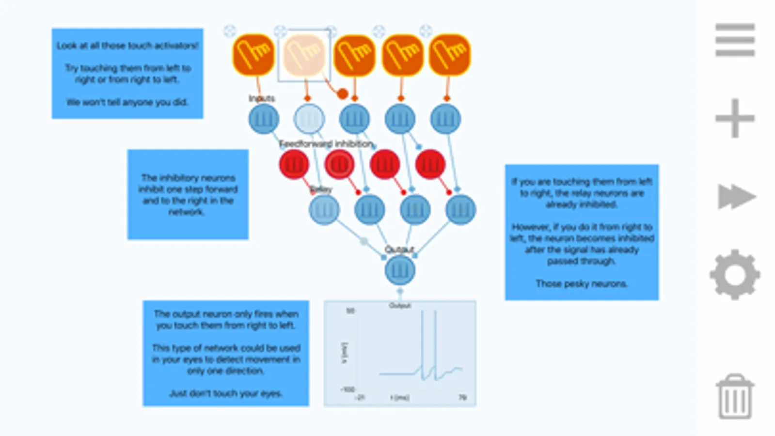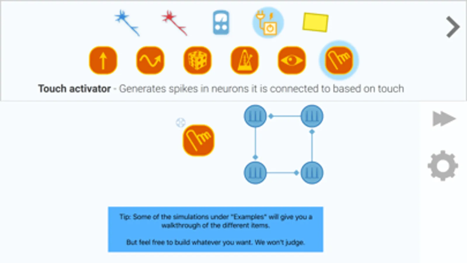 To build and explore neural networks, you drag neurons and measurement devices onto the screen. In addition, the app comes with several ready-made simulations for inspiration.