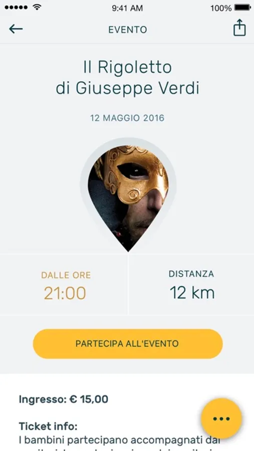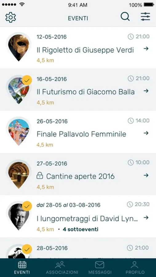 - VETRINA EVENTI: l’associazione può configurare un evento e associarlo a una o più aree tematiche, mentre l’utente può filtrare le tipologie di evento che gli interessano. Per ogni evento è indicata la data e la distanza dall’utente in quel momento