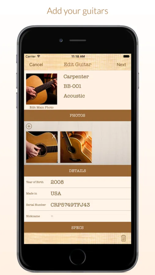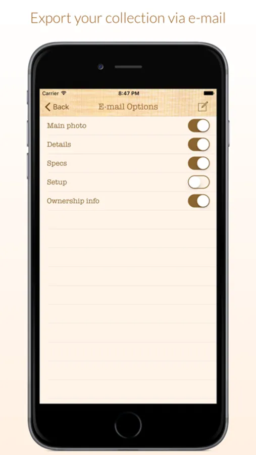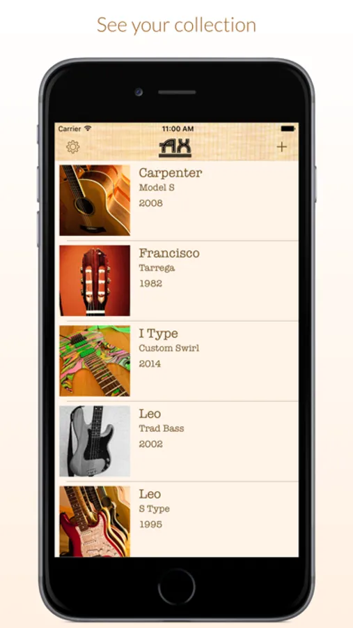 - Custom export info for your entire collection via e-mail. For example, to send to your insurance provider or guitar tech.