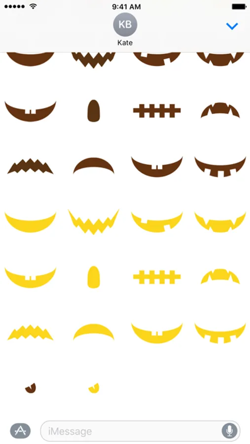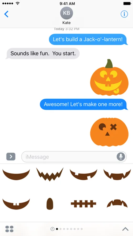 Trade stickers to carve out your very own Jack O' Lantern. To "carve" your own pumpkin, first send the blank orange pumpkin as its own iMessage. Second, press and hold to drag the eye's, nose, mouth, stem, or tongue cutouts onto the blank pumpkin sticker. Enjoy your freshly "carved" pumpkin!