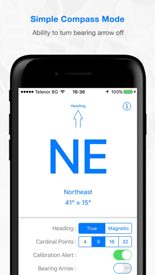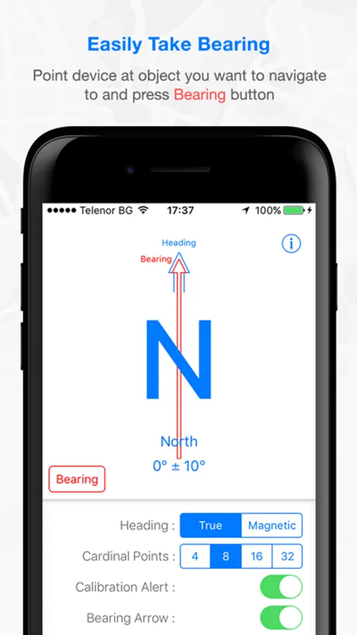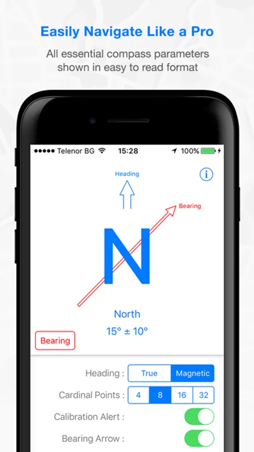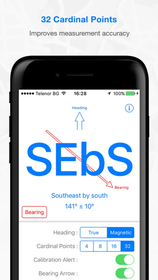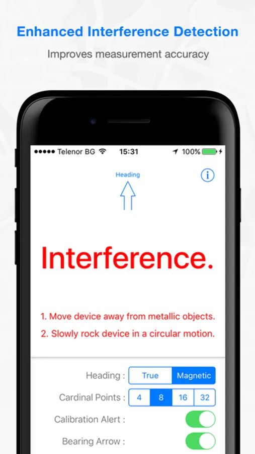 The accuracy shown is determined by the device and operating system, not the application. The best accuracy obtainable is typically +/-10 degrees.