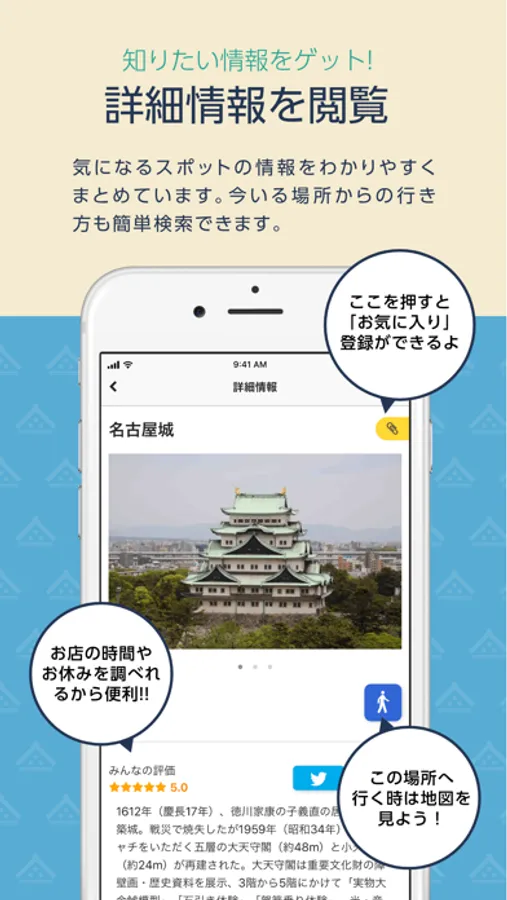 It offers a “Course” feature that suggests theme-based tour routes and a “Navi” feature that guides you to your target destinations. It includes an offline map that you can view without Internet access.