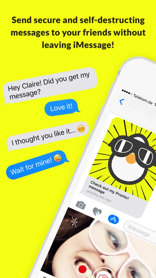 Pronto! is the ONLY app that allows you to send disappearing messages to your friends directly through iMessage, WhatsApp, Facebook, Twitter, Facebook Messenger, WeChat, Slack or any other communication app. You can finally securely send photos, videos, or text messages using any app you normally use to communicate with your friends.