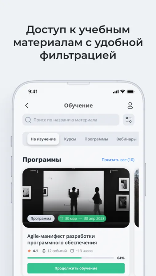 Обучение. Раздел, где хранятся курсы, вебинары, мероприятия и программы. С понятными подсказками: что нужно пройти, когда дедлайн, что уже пройдено.