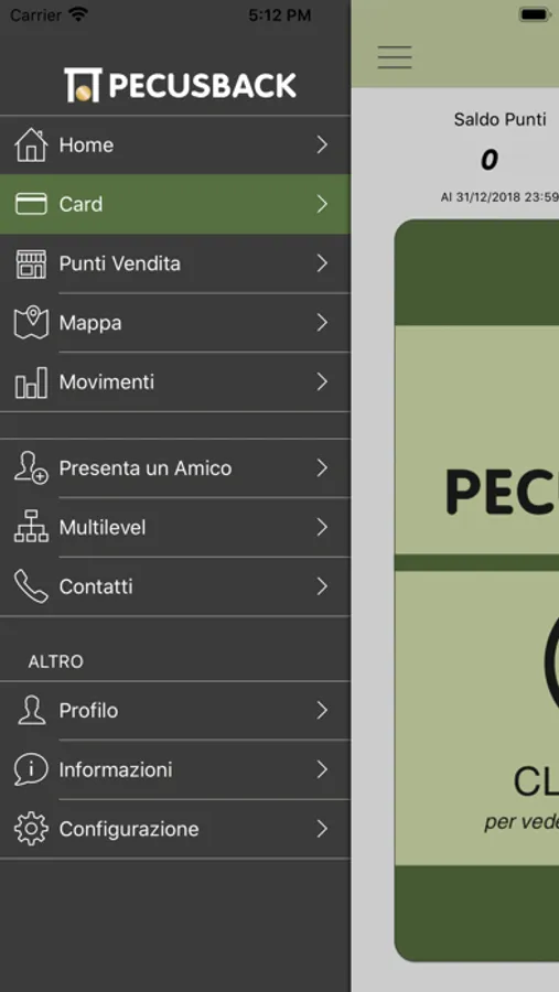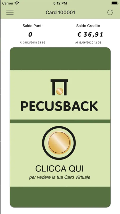 Card: visualizza la tua Card Virtuale che devi esibire ogni qualvolta effettui un’operazione nel Circuito. Nella medesima schermata sono visibili il “saldo punti” totali ed il “saldo credito”.