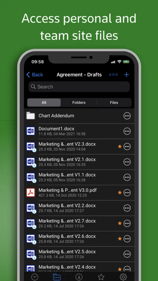 • Access your own files, as well as documents stored on other team sites, even those with restricted access.