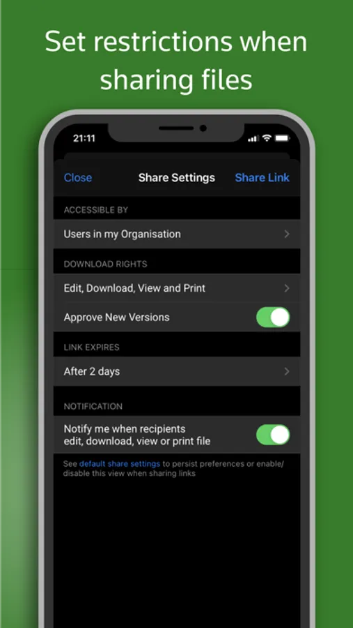 • Share secure links to files and apply recipient restrictions, including passwords and expiry dates.