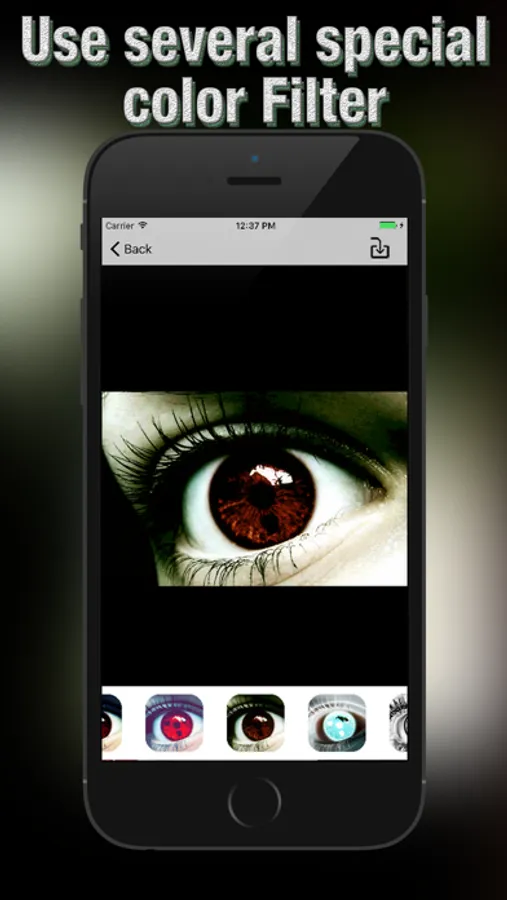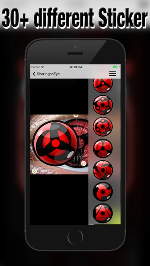You can choose between serval Sharingan eyes. Take a picture or choose one from your camera roll, load your favorite eye and apply some awesome filter to it.
