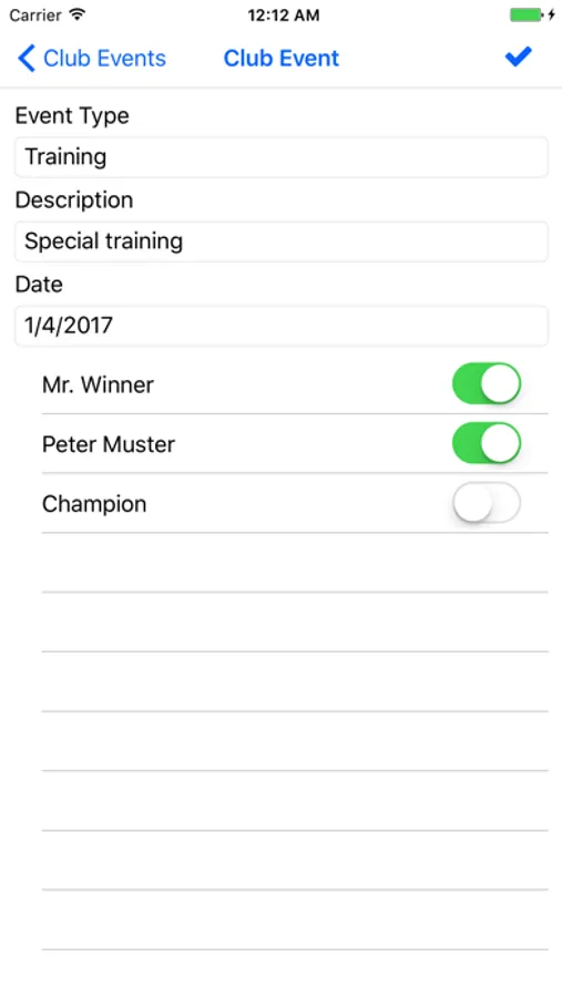 Good sorted selection options for members and event types help for fast registration. Members with highest ranking appear on top in the selection. Event types which are used most often appear on top. Each event has an event type, a date, an optional description and the club members.