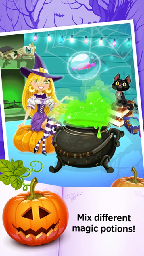 - Two sweet characters: witch Candy and her adorable Halloween Cat;